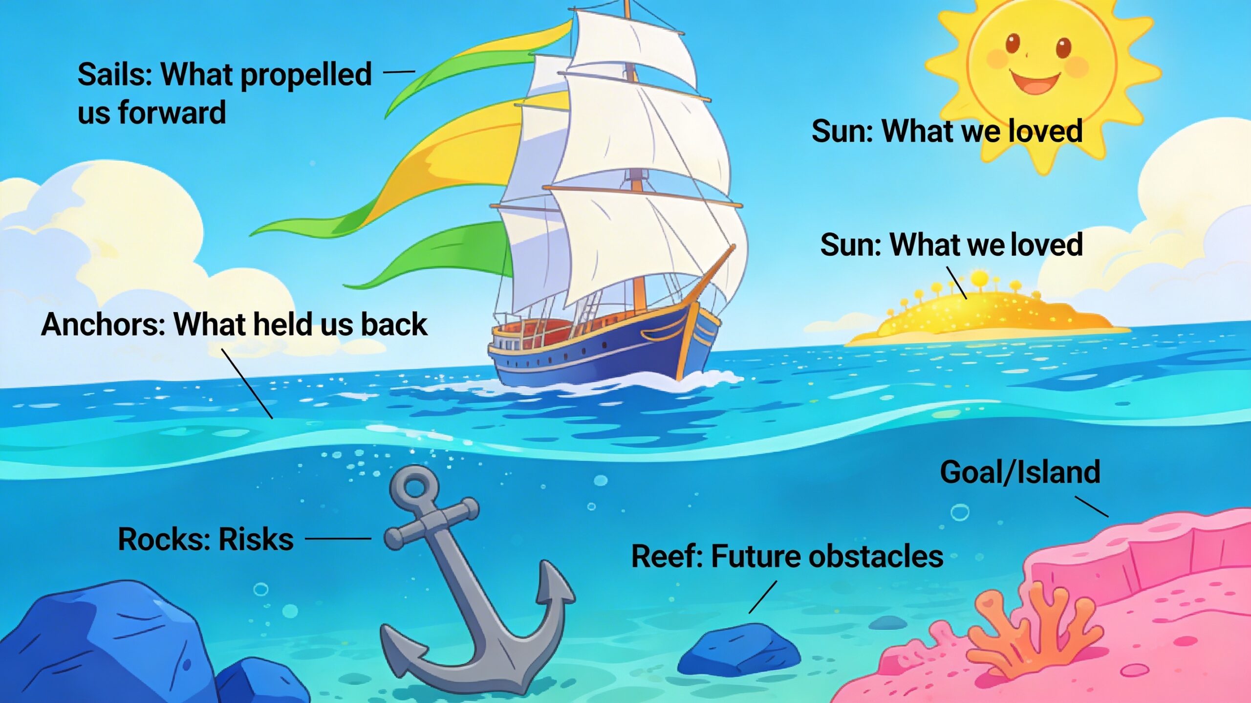 Ask the team to add sails and anchors to their boat. Sails represent things going well, what’s good, and what is putting the wind into their sails. Anchors are the things that could be going better, the anchors holding them back and limiting progress.