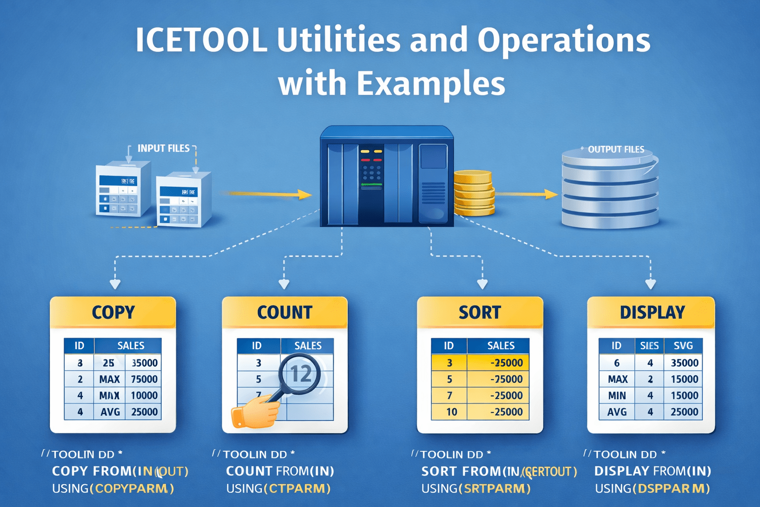 PGM=ICETOOL in the EXEC statement.TOOLIN – contains ICETOOL control statements.IN, IN1, IN2) and output (OUT1, OUT2, RPT) DDs.TOOLMSG and DFSMSG – for messages and diagnostics.//ICETOOL JOB (ACCT),'ICETOOL DEMO',CLASS=A,MSGCLASS=X