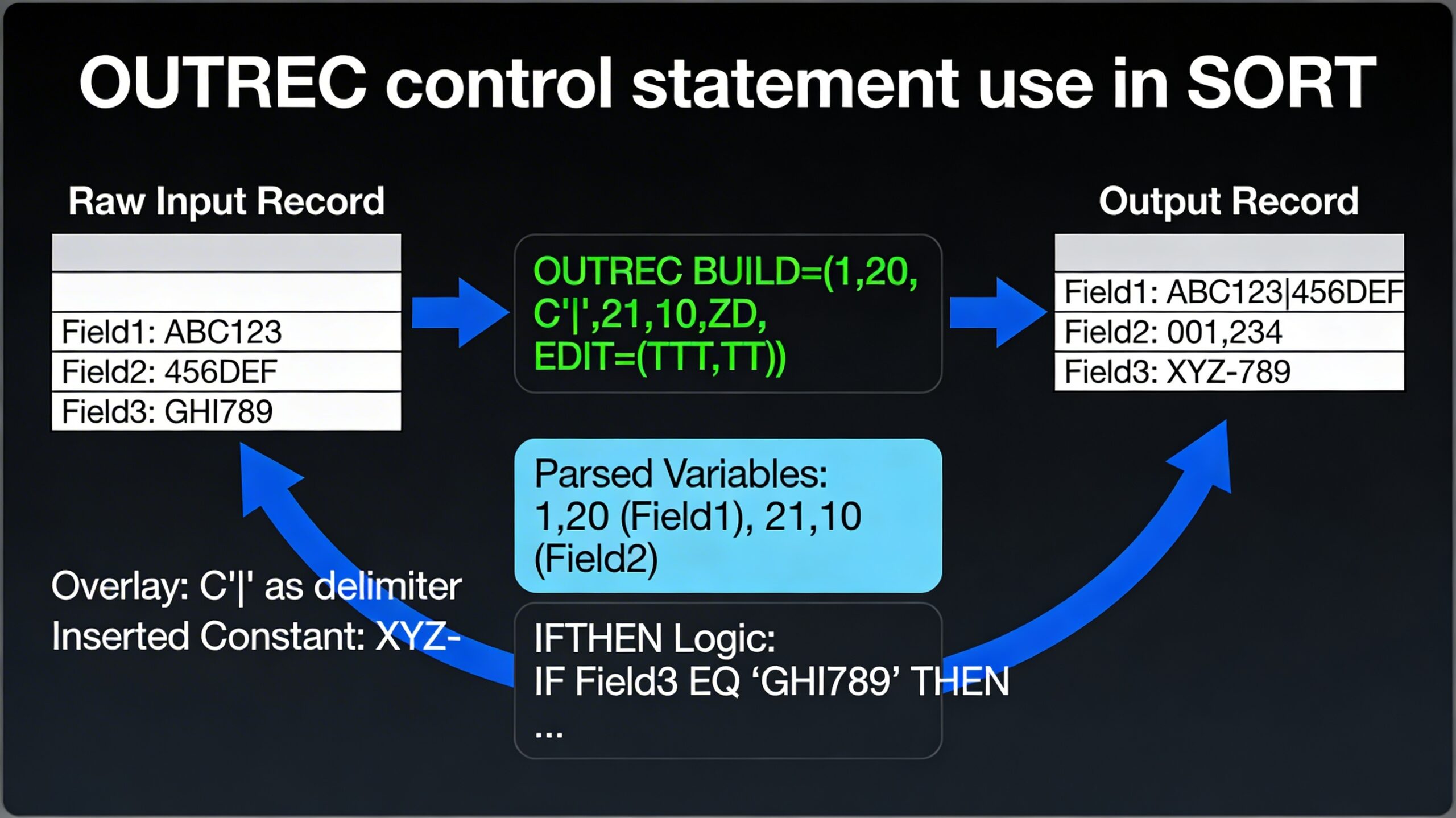 The OUTREC control statement in SORT is a powerful tool for customizing the output of a sort operation. It enables data professionals to manipulate records, rearrange fields, and perform calculations, all within the sorting process. As with any tool, it’s essential to practice and experiment with different scenarios to fully grasp the potential of OUTREC in SORT. Whether you’re reformatting dates, concatenating fields, or performing conditional replacements, OUTREC empowers you to mold your data exactly as needed.