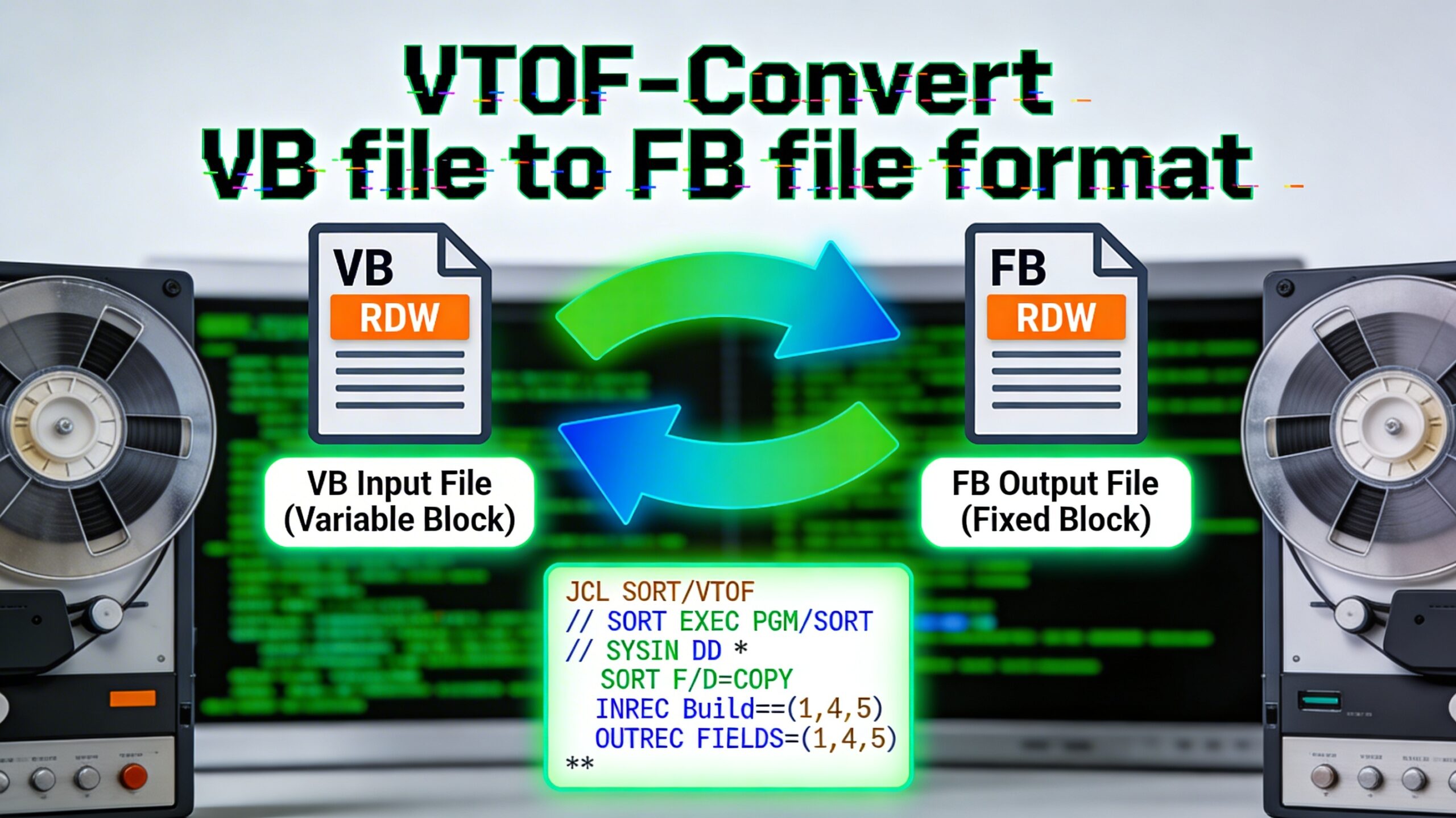 OPTION COPY: Tells the utility we are just copying data, not sorting it. OUTFIL FNAMES=FBOUT: Directs the output to the DD name FBOUT. VTOF: Instructs DFSORT to perform the Variable-to-Fixed conversion. OUTREC=(5,100): Tells the program to extract 100 bytes of data starting from position 5 of the input VB record (skipping the 4-byte RDW).
